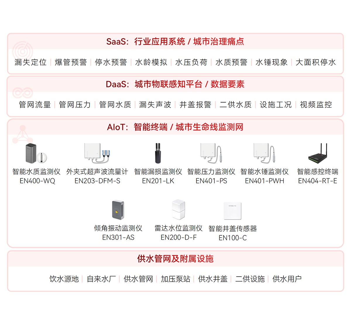 對供水管網設施及水質提供實時監測,通過各類智能監測終端保障供水壓力平衡、流量穩定和供水安全,及時發現爆管并預警,避免大面積城市停水事故發生,為管網爆管預警分析、用水趨勢分析和泄漏量預警分析提供數據支撐。